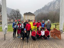 Der Wettergott meinte es gut mit den 20 Läufer:innen, die sich bei leichtem Schneefall und Temperaturen um ca. 0 Grad im Reichenfeld trafen. Nach dem obligatorischen Gruppenfoto ging es zum „Rädle“ auf dem Blasenberg. Dann über Tosters in die Kapfschlucht, wo der steile Anstieg zum Wasserschloss begann.